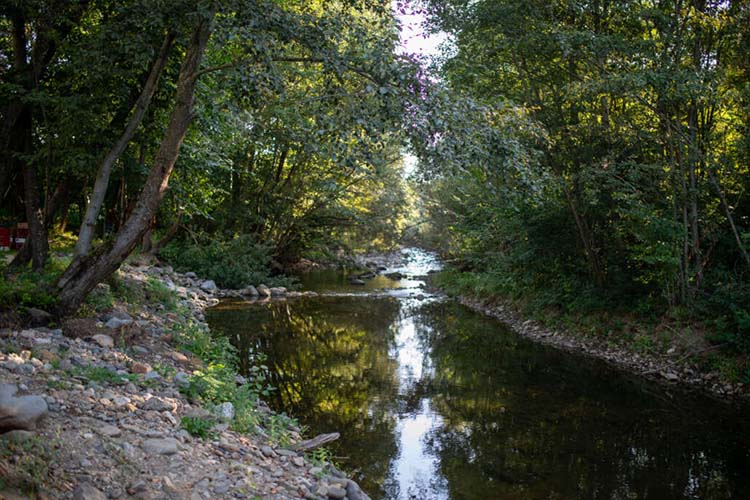 Mini‑plajă lângă pârâu, perfectă pentru zile călduroase.